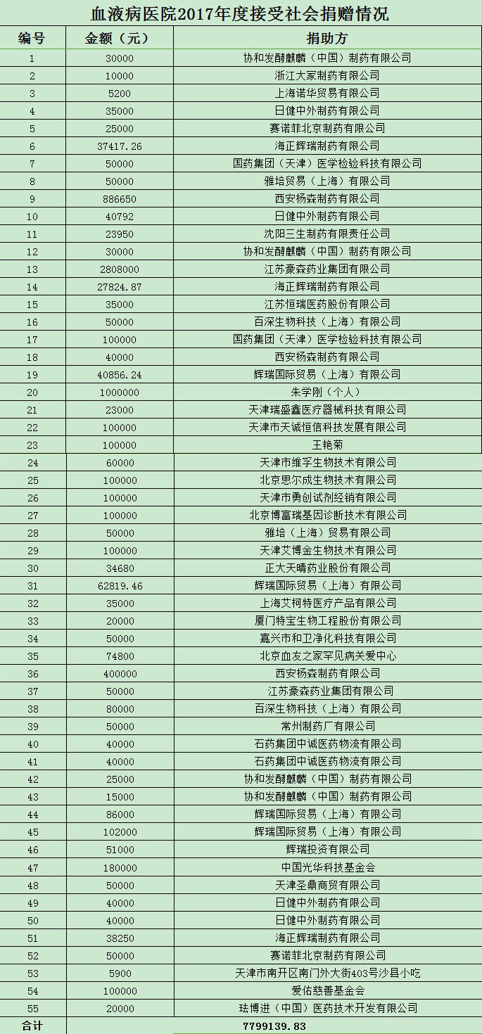 2017年院所共签署社会捐赠协议55项,金额合计779.91万元,37名员工申请使用捐赠款参加学术会议,8个科室部门申请使用捐赠款举办学术活动和用于患者诊疗,同时院所承办的血液病理诊断高级技术培训班、血液病理高峰论坛、淋巴瘤高峰论坛等国际、国内学术会议使用了专项捐赠款项,具体捐赠情况见附表。