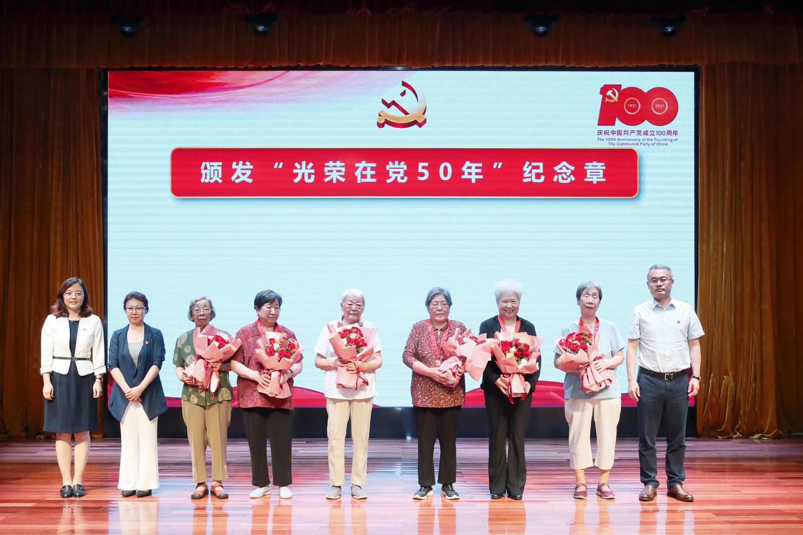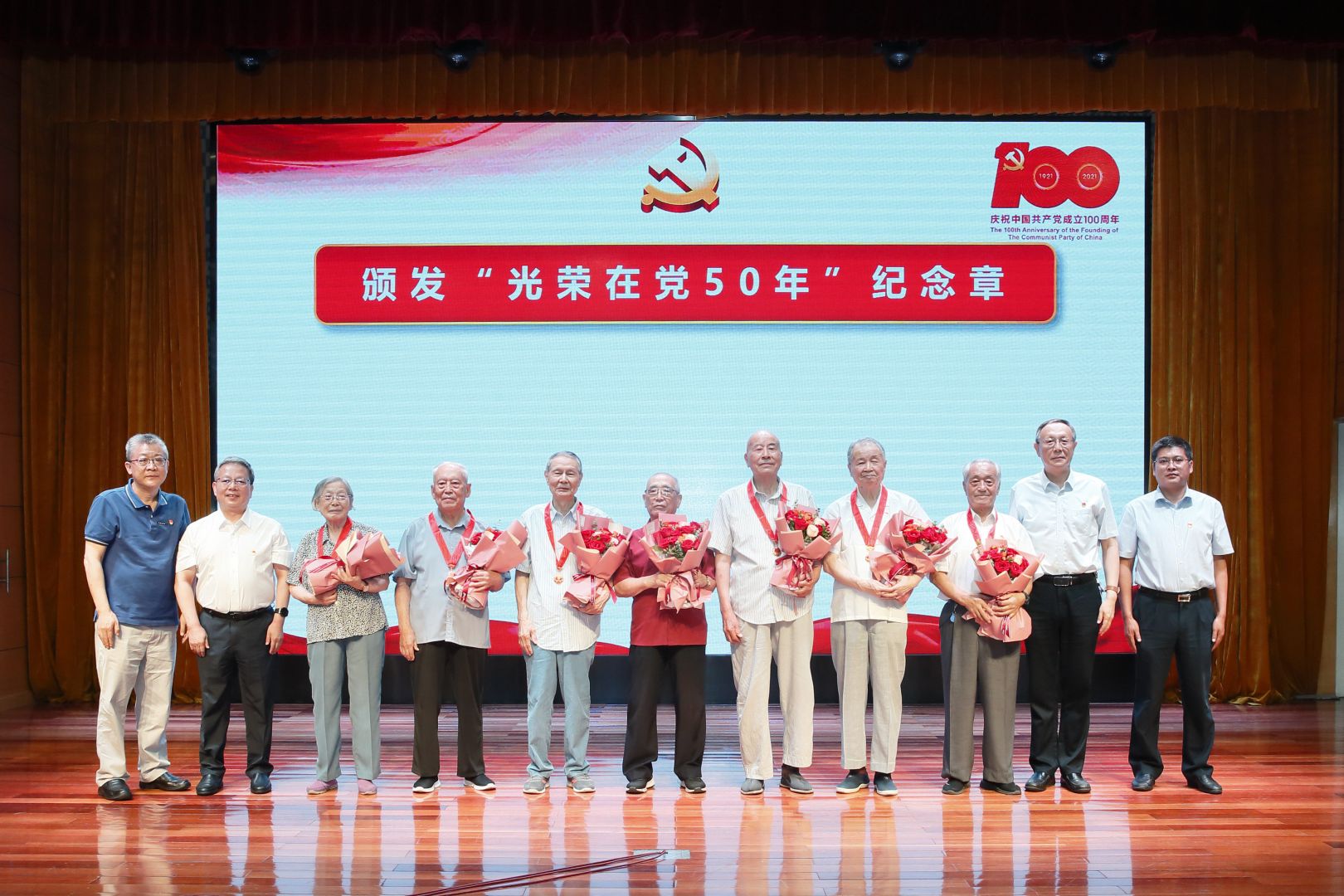 伴随着庄严的国歌,大会正式开始。为老党员颁发纪念章是本次大会的重要内容。姜艳玲副书记宣读了所院党龄超过50年的36位老党员名单,并播放了由宣传科倾情制作的专题片《半个世纪的坚守》,17位党龄超过50年的老党员从初心、坚守、见证、愿景、铭记五个维度讲述了自己初识中国共产党时的难忘经历、半个多世纪以来坚守初心使命的心路历程、对党员身份的理解和对中国共产党的深厚感情,对党和祖国的美好祝愿以及对青年一代的寄语期许。他们深厚的家国情怀和朴素的为民宗旨深深感染着参会的每一位人员。在全场热烈的掌声中,严文伟、仲涛、褚建新、郝文博、朱魁焕、郝玉书、李贵山、唐宝文、王敏、阴玉珍、马玉如、张桂珍、宋德英13位老党员登上舞台,接受党委委员为他们颁发“光荣在党50年”纪念章和带着所院全体职工祝福的鲜花。