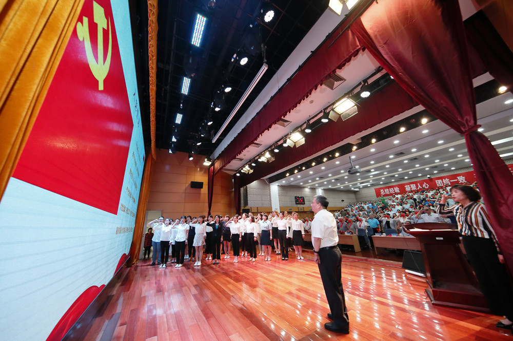 面对着庄严的党旗,常子奎书记带领新党员入党宣誓,全体党员重温入党誓词。铮铮誓言尽显所院全体党员对中国共产党的忠诚信仰和为我国血液学事业不断奋进的坚定信念。