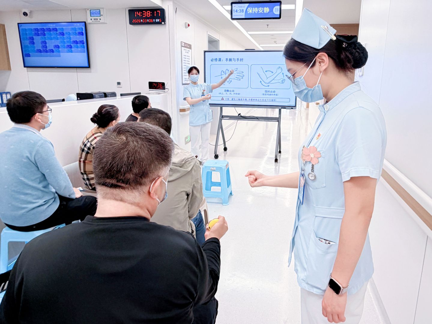 活动中,团员孙静茹详细讲解了PICC置管的具体流程以及如何精准观察、有效处理置管期间PICC导管并发症等重要内容;党员们为大家全面普及了居家期间科学观察、合理开展功能锻炼以及准确把握换药时机等实用知识,并对患者提出的问题逐一进行了专业解答。随后,党员杨霞为患者们进行了PICC功能锻炼操的示范,耐心讲解动作要领。现场患者及家属认真学习,积极踊跃参与互动。