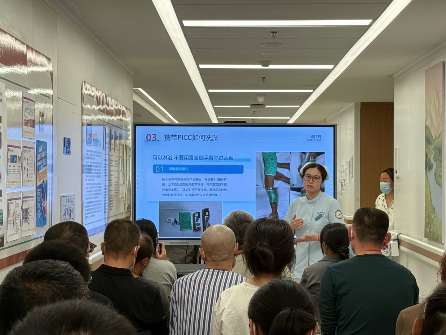 白血病患者在化疗间歇期,需携带PICC导管出院休息10至14天后,再进行下一疗程治疗。如果居家期间PICC导管维护不当,可造成导管部分脱出、导管相关性感染等并发症,增加患者痛苦。活动中,护士薛慧从白血病患者的实际需求出发,详细介绍了饮食管理、感染预防等居家护理的注意事项,并针对PICC导管这一关键内容进行了细致的讲解,通过抢答的形式帮助患者及家属熟练掌握科学的护理方法,提升居家照护质量。