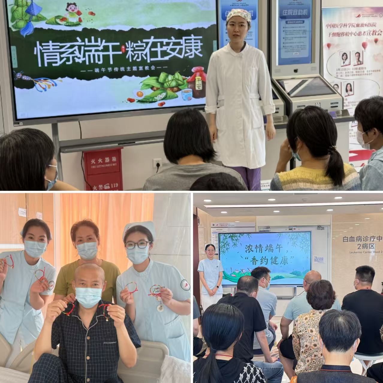 移植病房C区和D区围绕“情系端午‘粽’在安康”的活动主题,介绍了端午节的起源和习俗,以端午节的饮食习惯为切入点,讲解了患者移植不同阶段的饮食和饮水原则。干细胞移植中心二病区开展血栓预防知识科普活动,增进患者及家属对血栓的了解,并为大家送上节日的祝福和寓意健康的五彩绳作为纪念。白血病诊疗中心二病区向患者和家属进行节日安全宣教,重点讲解了陪护与门禁管理、微波炉加热管理的相关规定,强调共同维护病房公共卫生环境,营造安心、安全的病区氛围。