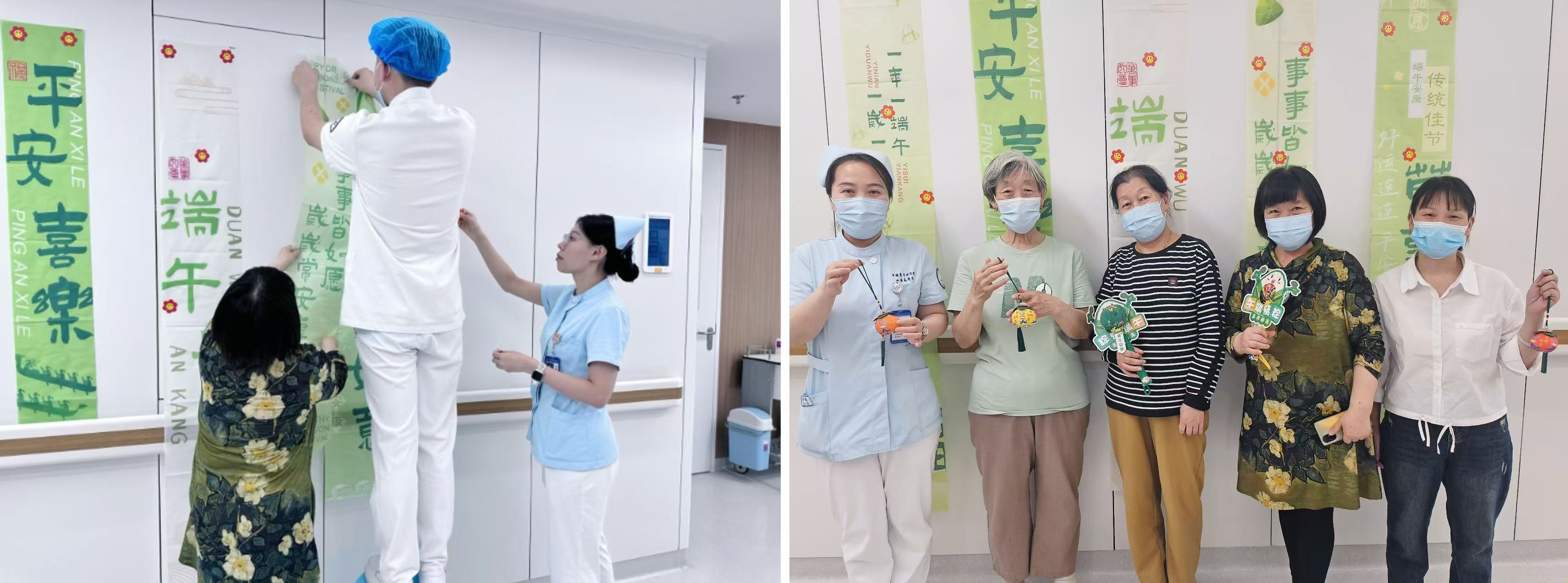 GCP中心I期病房联合重症医学诊疗中心综合病区举办端午节故事会活动,医护和患者、家属用彩绸一起装点病房,围坐畅谈关于端午的美好记忆和家乡的传统习俗,现场欢声笑语不断,气氛温馨融洽。
