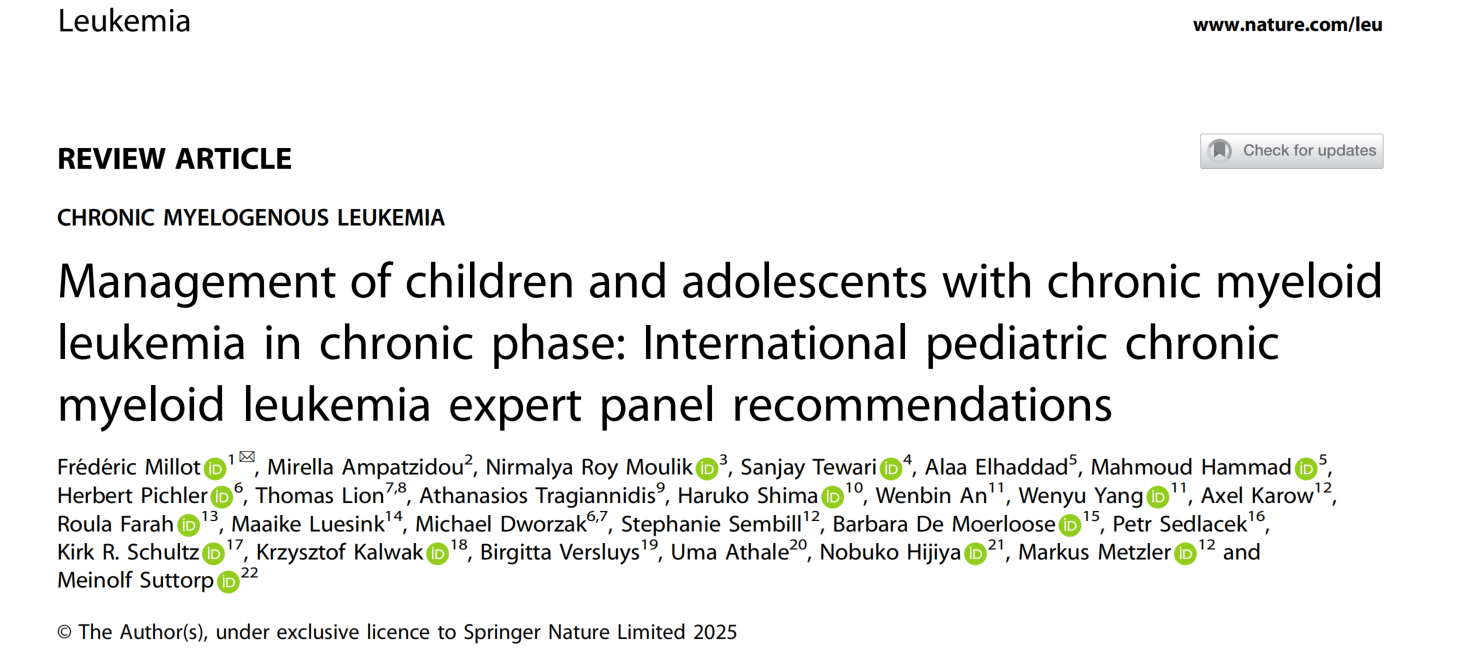 近日,《Leukemia》(IF= 12.8分)在线发布了题为“Management of children and adolescents with chronic myeloid leukemia in chronic phase: International pediatric chronic myeloid leukemia expert panel recommendations”的国际专家共识(原文见附件)。所院儿童血液与肿瘤诊疗中心杨文钰主任医师、安文彬主治医师参与了该共识的制定,并撰写部分章节。