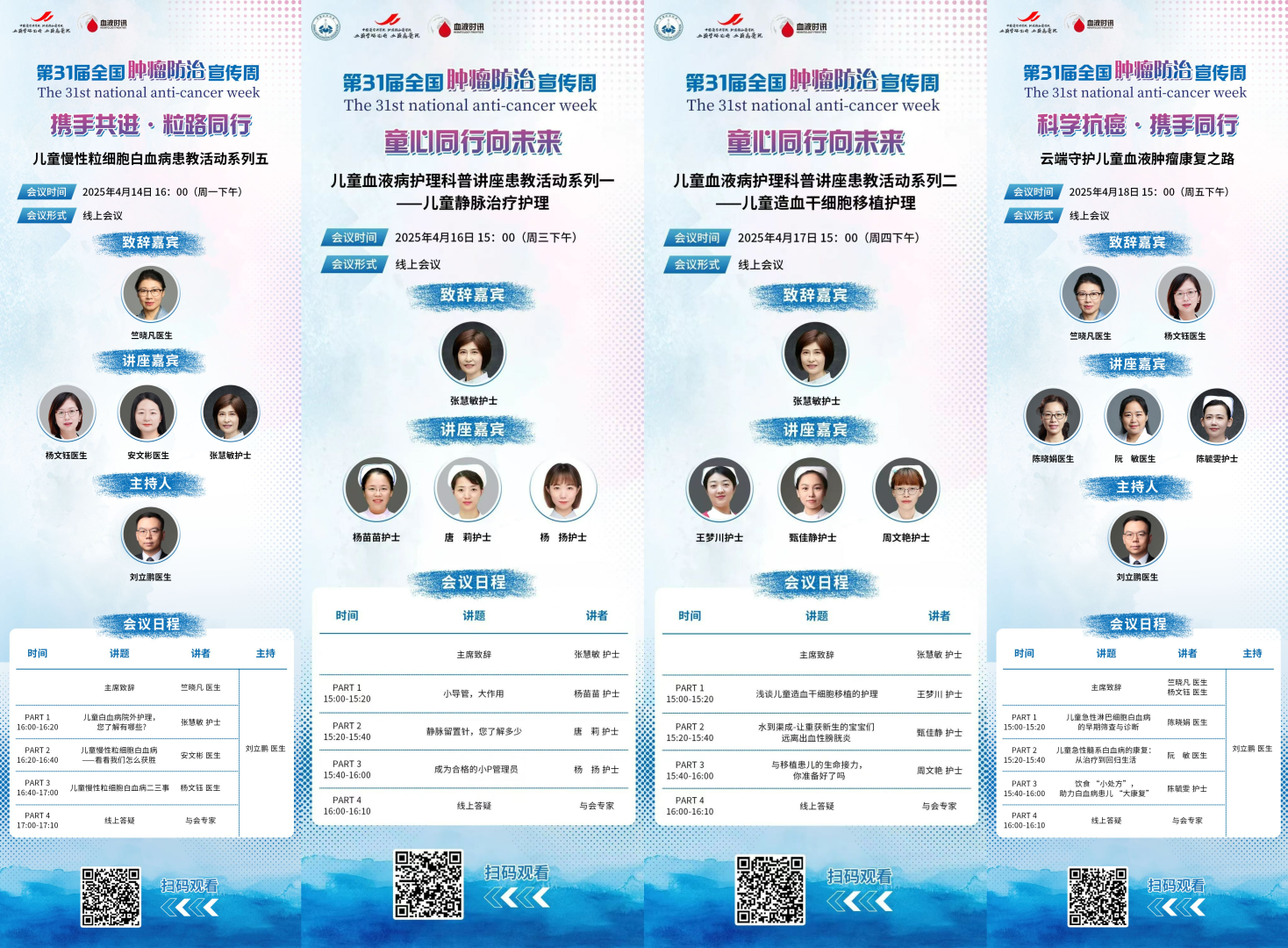 为帮助患儿家庭加深对儿童血液肿瘤防治知识的了解,搭建医患沟通桥梁,在第 31个全国肿瘤防治宣传周期间,儿童血液与肿瘤诊疗中心面向患儿家庭及社会大众组织开展 “守护成长,为爱续航”系列线上健康科普活动。