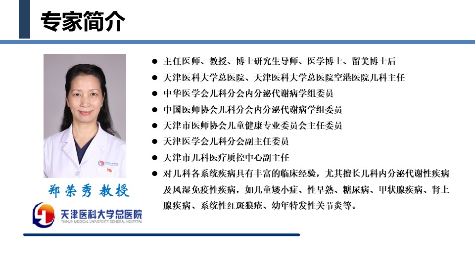随后,天津医科大学总医院郑荣秀主任详细讲解了骨髓衰竭性患儿常见的内分泌系统问题,并从生长发育障碍、甲状腺疾病、性发育障碍、肥胖/糖代谢紊乱等方面为家长们介绍了发病原因和解决办法。
