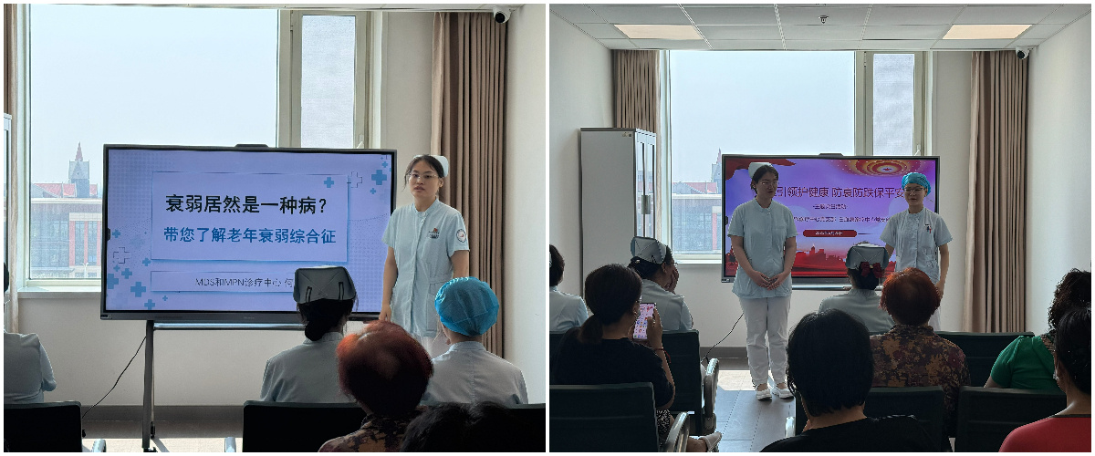 活动中,MDS和MPN诊疗中心党支部党员何佳以“衰弱居然是一种病”为题,讲解了衰弱的病因、临床表现,指导患者及家属如何早期识别衰弱信号并加强自我管理。白血病诊疗中心党支部团员曹鑫愿、马悦通过现场示范,展示了“起床三步曲”和“保护性跌倒姿势”等安全技能,并通过分步讲解与实操互动,使患者及家属掌握了日常行动中的防跌技巧,进一步提升了安全防护能力。