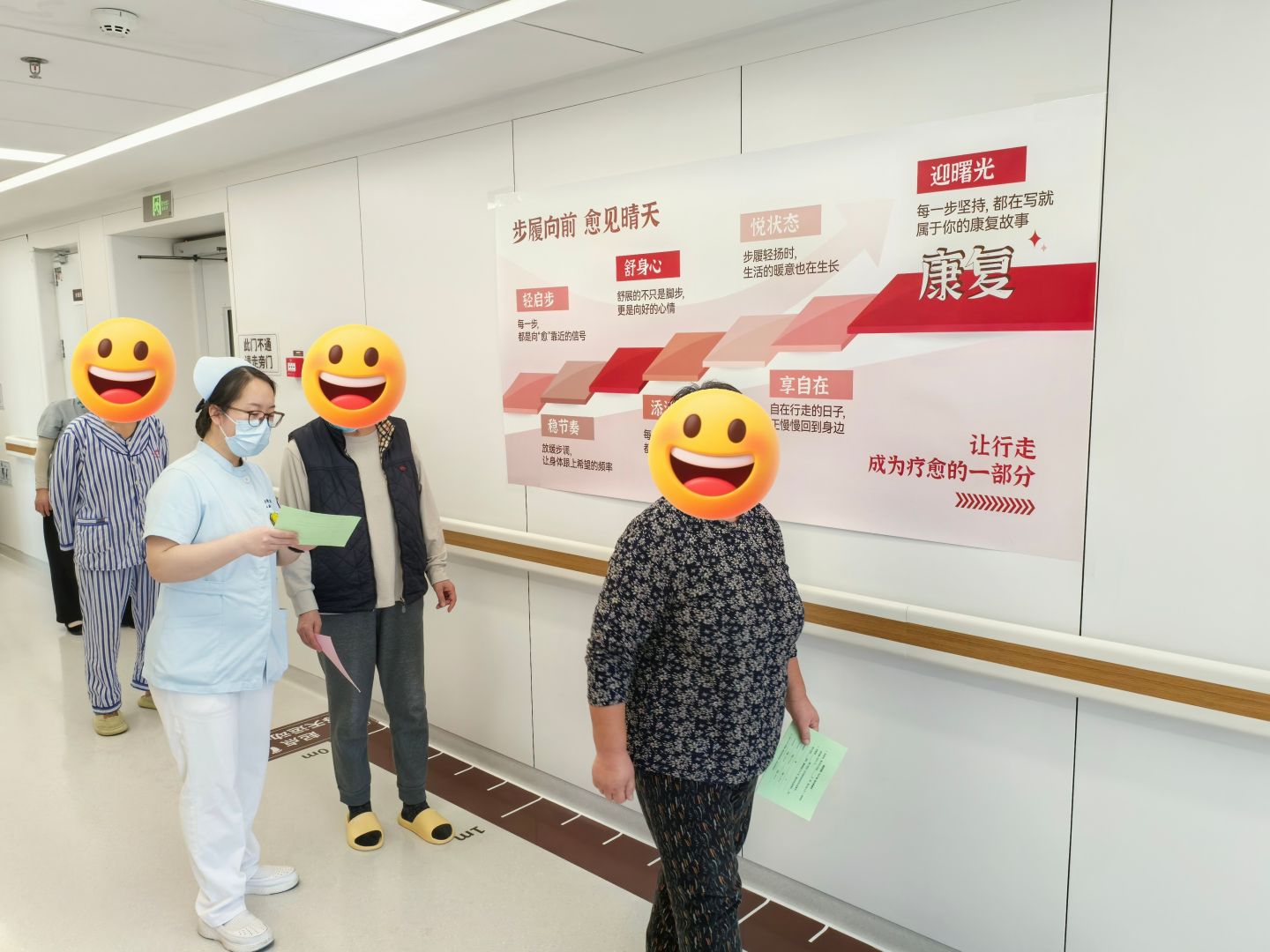 理论讲解后,护士带领大家来到病区的步行康复区,开展“步履向前,愈见晴天”行走训练,详细解释了为什么“4.57米步行时间”是衡量老年人是否衰弱的重要指标,提示大家规律且适度的运动能有效预防老年衰弱并降低跌倒风险。随后,护士现场演示了正确的步行姿势与节奏,在轻松的氛围中把“让行走成为疗愈的一部分”的理念传递到患者心中。