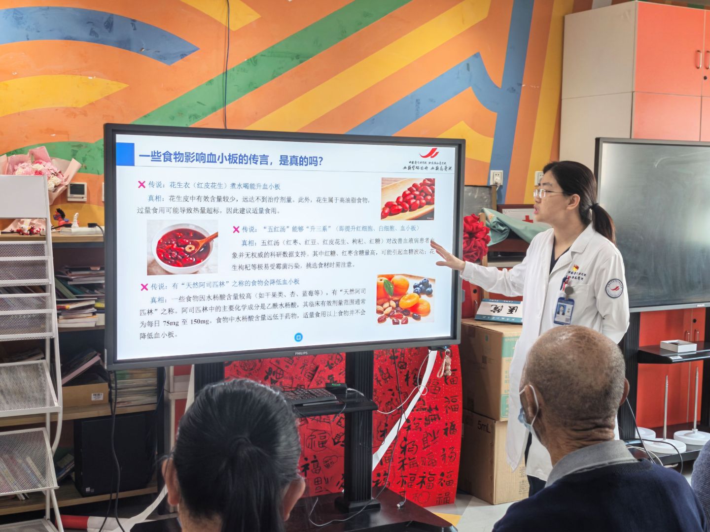 活动前,两位支部书记及党员宋珊珊充分发挥模范带头作用,提前调研并梳理患者营养及护理高频问题。活动现场,党员李叡围绕血液病患者常见营养问题展开讲解,重点说明粒细胞、血小板偏低时的饮食原则,纠正常见食疗误区,详解肠内营养配方选择与蛋白粉规范使用要点。党员鲍本霖聚焦低钾血症防治,科普钾的生理作用及低钾血症典型症状,梳理致病原因,详解三大补钾途径,提醒规避补钾误区。其余党员分工协作,发放宣教手册,一对一解答个性化疑问,提供针对性指导。