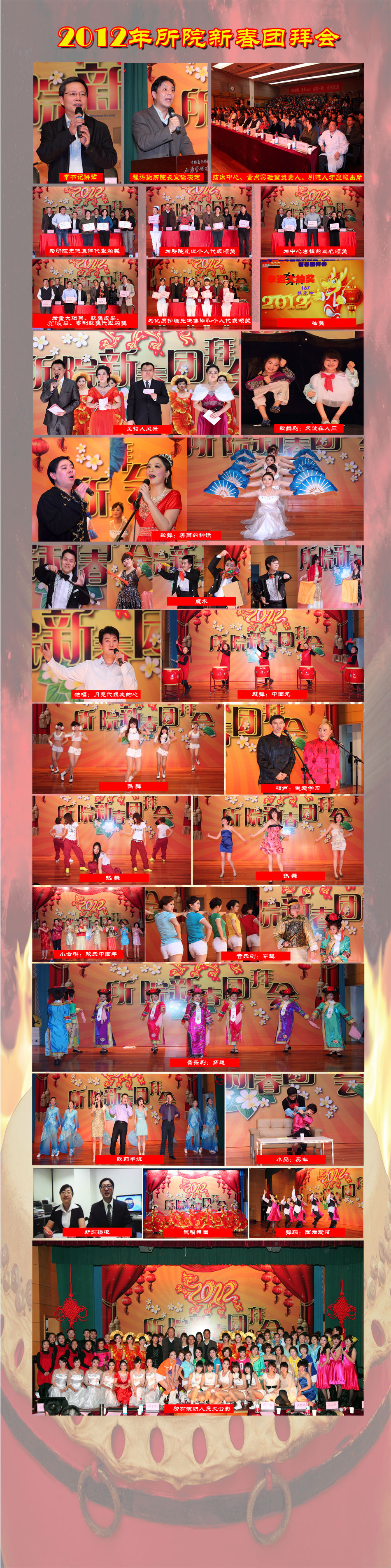 2012年1月18日,所院新春团拜会在多功能厅召开,所院领导班子全体成员、各中心主任、重点实验室引进人才等应邀出席团拜会。会上,全体职工观看了由宣传科拍摄制作的展示所院2011全年重点工作的纪录片《2011这一年》,并对所院先进集体和个人、中心考核前三名、重大项目、获奖成果、SCI收录、专利获奖,以及优质护理先进集体和个人进行了表彰。