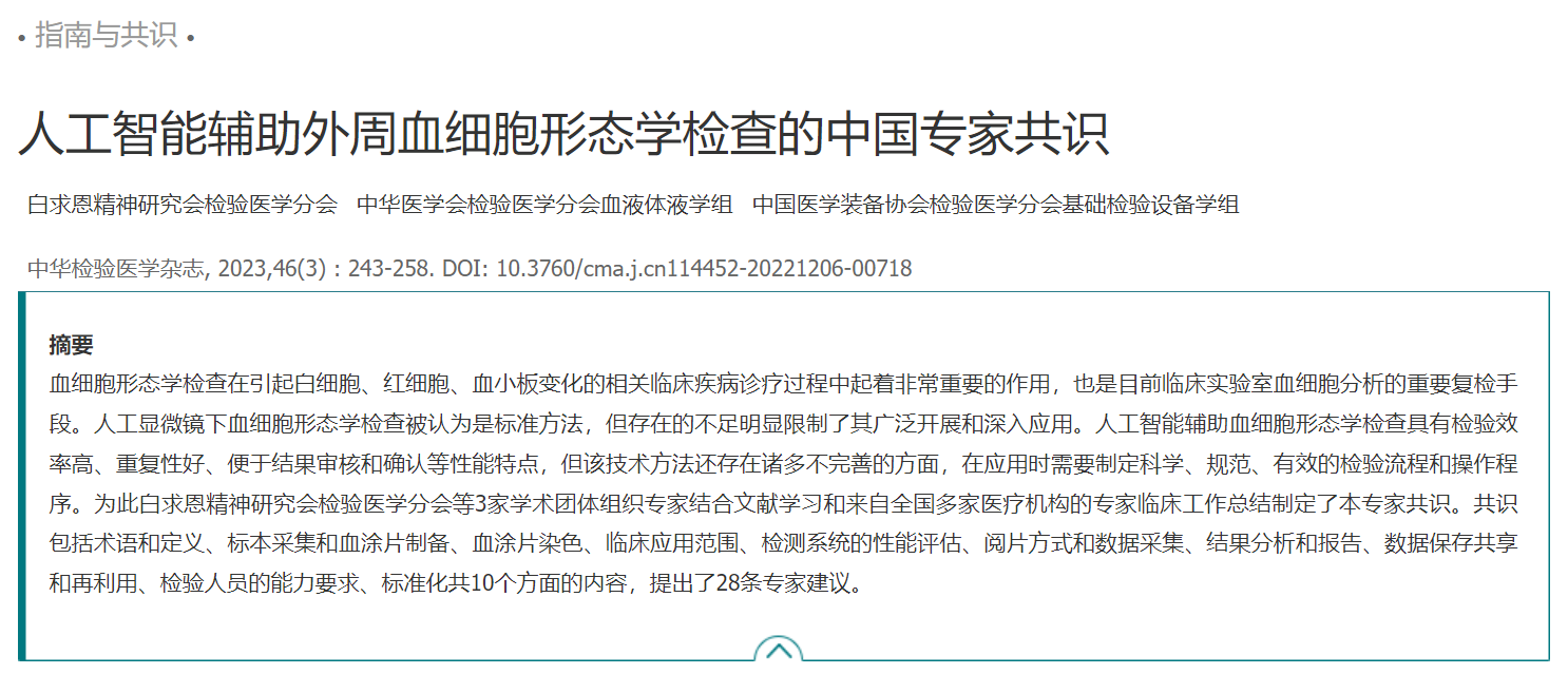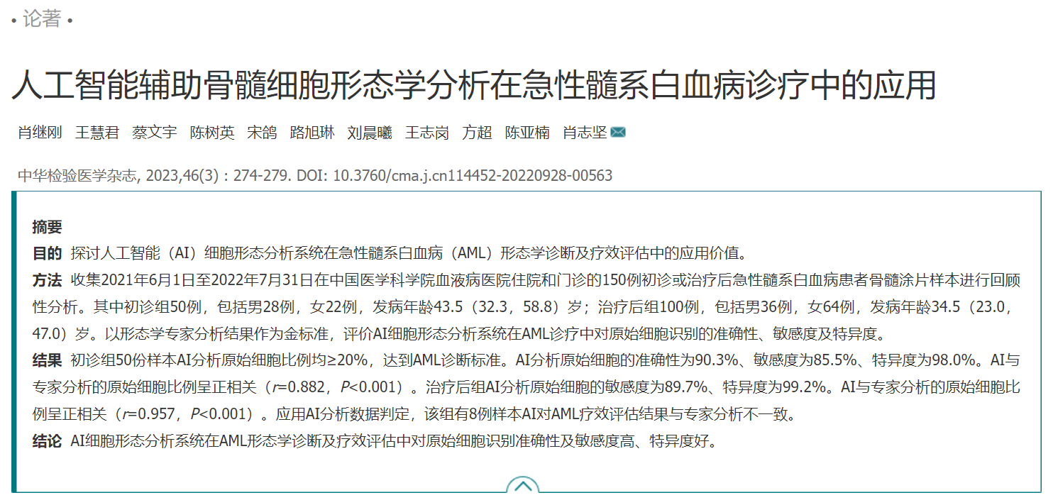 近年来,所院持续聚焦行业前沿科技,凝聚国内外优质资源,积极推动大数据、人工智能技术赋能临床检测形态学发展。2023年,由肖志坚、朱国庆、夏永辉等参编的《人工智能辅助外周血细胞形态学检查的中国专家共识》,由肖继刚、王慧君、肖志坚等撰写的《人工智能辅助骨髓细胞形态学分析在急性髓系白血病诊疗中的应用》同时在最新一期(2023年3月)《中华检验医学杂志》上发表。未来,随着科技的不断进步,人工智能技术的持续发展,临床检验形态学将迎来新的发展机遇。血研所人将紧跟行业发展步伐,提高临床检验工作规范化、标准化水平,为持续推动临床检验诊断学及血液病理诊断学发展贡献新的智慧和方案。