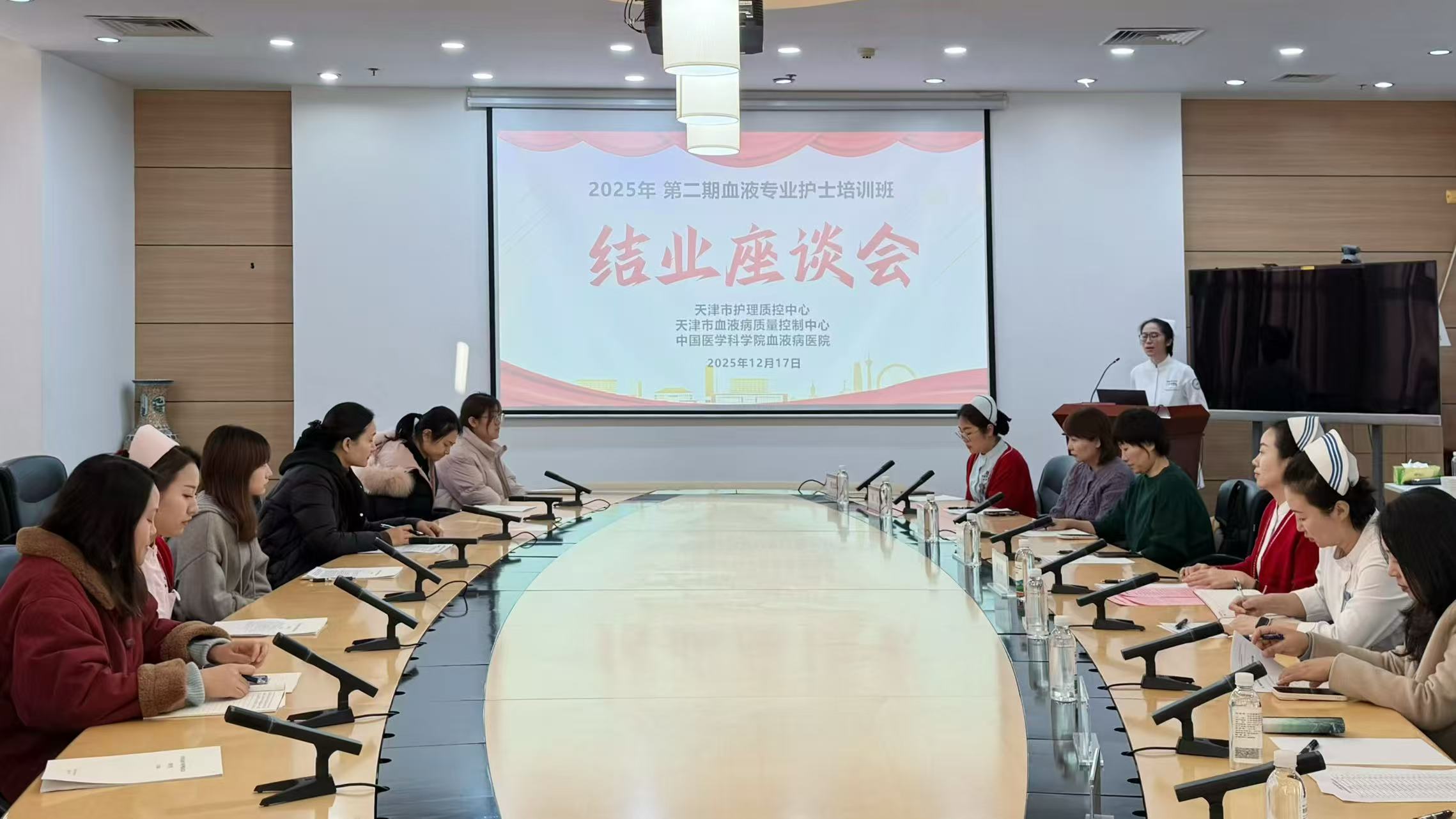 12月17日,天津市第二期血液专科护士培训班结业座谈会在所院举办,来自全市多家医院的22名护理骨干围绕白血病、淋巴瘤、造血干细胞移植、CAR T免疫治疗及临床试验护理等专题,在所院完成了“2周理论+2周实践”的系统培训。座谈会上,护理部主任解文君、培训班授课教师及全体学员共同回顾培训成果,深化专业交流。
