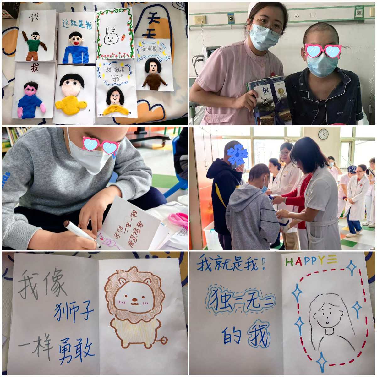 在活动教室,党员同志们和孩子们一起重温了每个人最喜欢的一本图书,随后,又带领孩子们一起阅读了《我爸爸》《我妈妈》两本绘本。绘本用精美的图画和简单的文字为患儿展现了其乐融融的幸福家庭,让患儿们感受到浓浓的家庭之爱。为了培养孩子们的绘画和动手操作能力,党员同志们带领患儿们一同制作属于自己独一无二的“书”——《我》。每个患儿都是小画家,他们各展所长,用心描绘美好,用画笔和黏土将属于“我”的故事制作成一本本特别的书籍,为大家展现了一个精彩纷呈、童心画语的世界。活动现场,患儿们还向大家分享了自己的作品《我像鱼一样自由》《我像狮子一样勇敢》。活动最后,党员代表为患儿们送上图书,并祝福孩子们在书中找到更大的世界,树立战胜疾病的信心,做更好的自己。