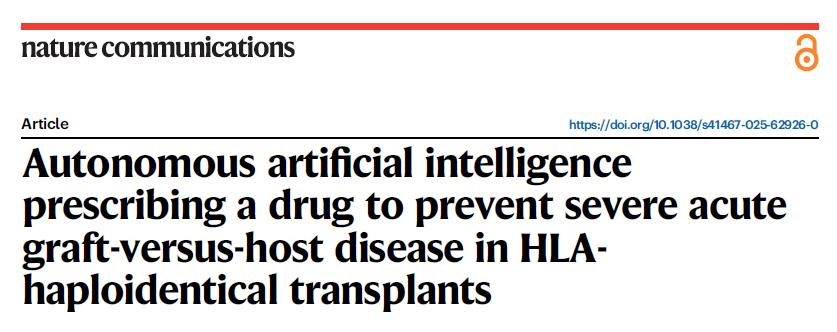 2025年9月25日,中国医学科学院血液病医院(中国医学科学院血液学研究所)陈俊仁/姜尔烈团队在《Nature Communications》杂志发表题为“Autonomous artificial intelligence prescribing a drug to prevent severe acute graft-versus-host disease in HLA-haploidentical transplants”的文章,首次报道条件式自主AI开立药物处方的临床实践[1]。