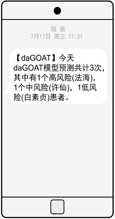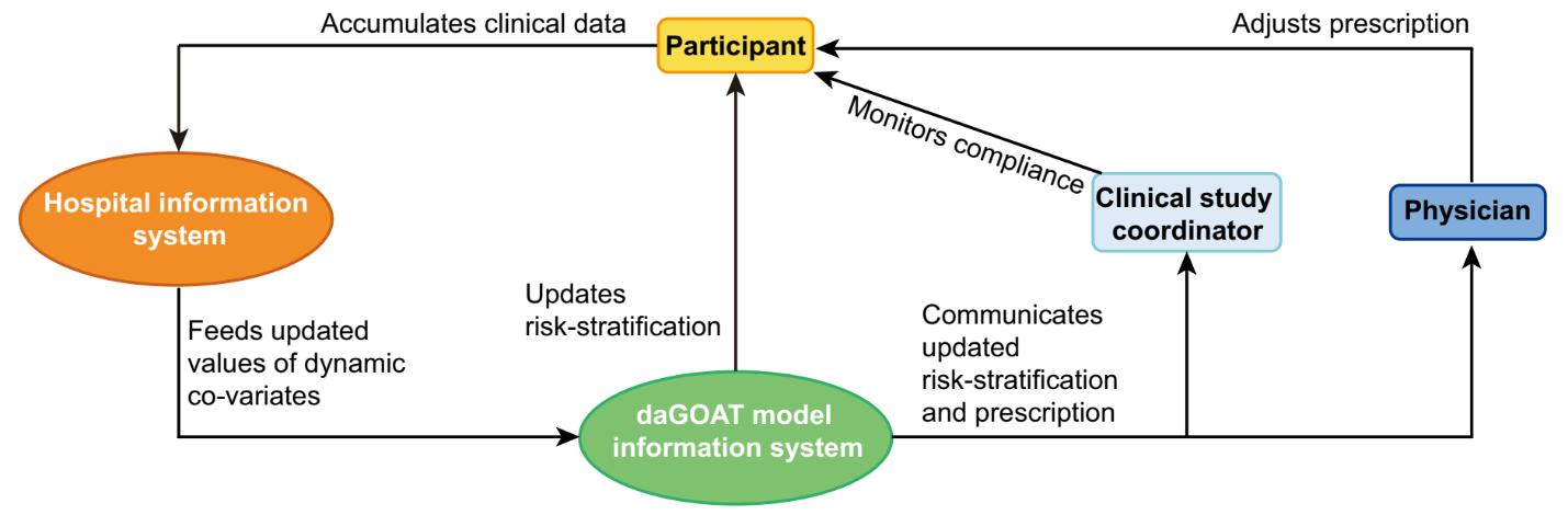 于是,研究团队开展单臂前瞻性临床试验,将中国医学科学院血液病医院(中国医学科学院血液学研究所)100%自主开发的条件式自主AI模型“daGOAT”[3]嵌入医院信息系统;AI模型每天自动读(抓)取造血干细胞移植患者体内多维度、动态变化的血液细胞组成、血液生化、炎症因子等上百项指标数据;AI模型像资深医生一样“思考”何时该增加免疫抑制剂的剂量,以及增加多少剂量最合适。