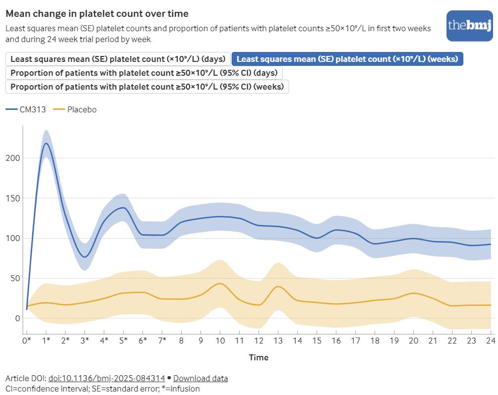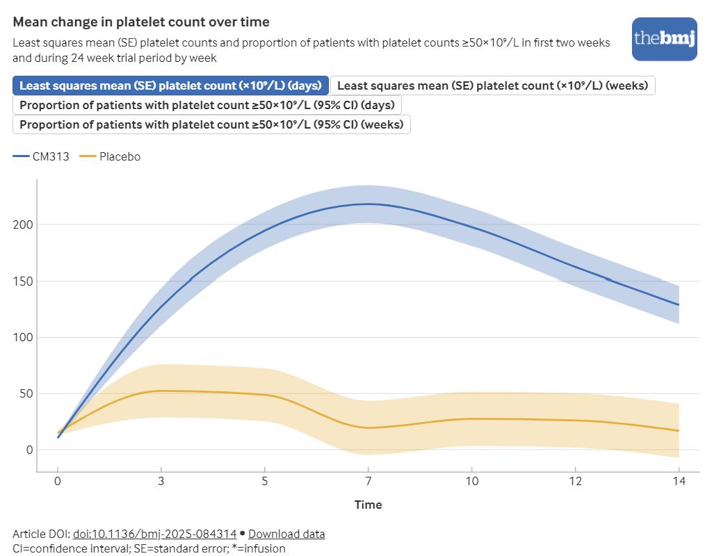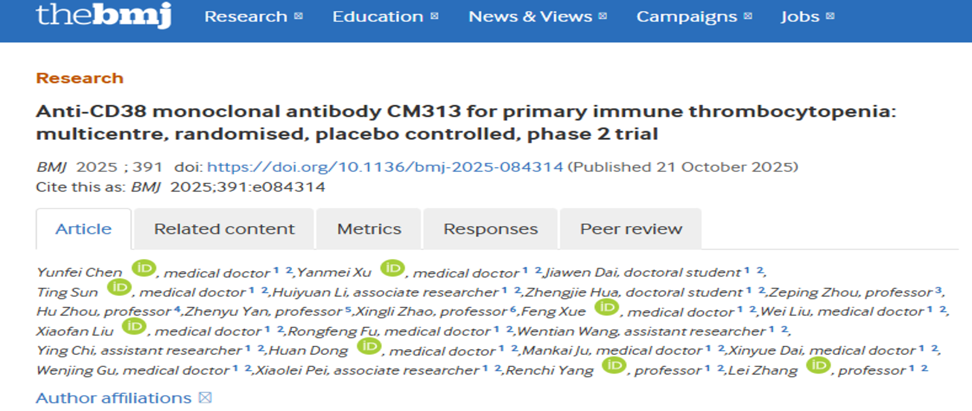 2025年10月21日,中国医学科学院血液病医院(中国医学科学院血液学研究所)张磊/杨仁池团队在国际四大医学顶刊之一《The BMJ》(IF=42.7)在线发表题为“Anti-CD38 monoclonal antibody CM313 for primary immune thrombocytopenia: A multicenter, randomized, placebo-controlled, phase 2 trial”的研究论文。该研究首次通过随机双盲、安慰剂对照设计,确证了CD38单抗在ITP中的双重功效——既能快速起效,又可实现长期缓解。