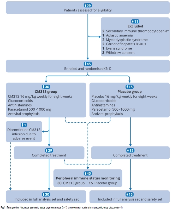 该研究为一项多中心、随机、双盲、安慰剂对照的II期临床试验(NCT06199089)。研究共纳入45例成人ITP患者,按2:1的比例将其随机分配至CM313组(n=30)和安慰剂组(n=15)。CM313组患者每周静脉注射CM313 16 mg/kg,连续8周;安慰剂组则接受等量赋形剂。研究的主要终点为第8周的总体有效率,定义为血小板计数在基线水平至少翻倍且达到30×109/L及以上,并在至少两次检测(间隔≥7天)中持续满足上述标准,同时无出血事件。
