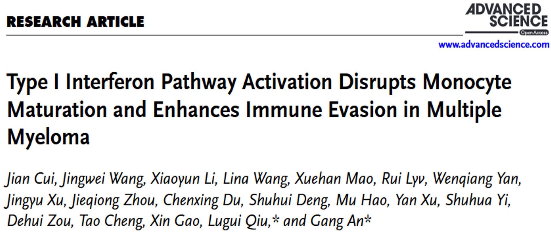 2025年11月30日,中国医学科学院血液病医院(中国医学科学院血液学研究所)安刚主任医师、邱录贵主任医师团队在《Advanced Science》(IF=14.1)在线发表题为“Type I Interferon Pathway Activation Disrupts Monocyte Maturation and Enhances Immune Evasion in Multiple Myeloma”的研究论文。本研究构建了MM患者外周血与骨髓单核细胞的单细胞图谱,发现其呈现显著增强的I型干扰素反应,揭示该信号驱动的异常发育路径在免疫抑制形成中的关键作用。