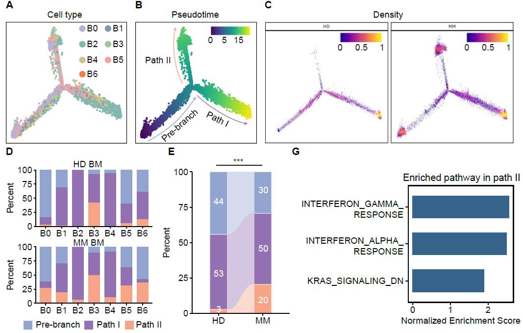 本研究从健康对照与新诊断MM患者外周血与骨髓中分选单核细胞,获得了超过13万个高质量单细胞转录组。研究共识别7类骨髓及外周血单核细胞亚群,包括经典、过渡及非经典单核细胞,并揭示了不同组织来源的显著转录差异。差异分析显示,与HD相比,MM单核细胞整体异质性变化有限,但呈现泛亚群增强的I型干扰素反应。通过发育轨迹重建进一步发现MM患者单核细胞呈现一条异常的由IFN驱动的发育路径,不同于传统由经典向非经典单核细胞分化的生理性发育路径。