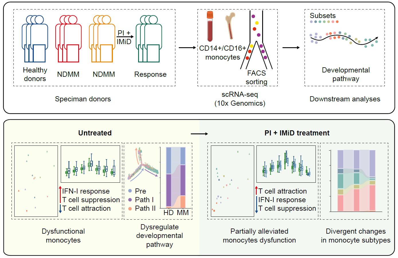 多发性骨髓瘤(MM)是一类由恶性浆细胞克隆性增殖引起的血液系统肿瘤,其发生、进展不仅依赖基因损伤,还受到肿瘤微环境(TME)深刻影响[1]。大量研究表明,TME中的多种免疫细胞亚群,包括调节性T细胞、调节性B细胞、髓系抑制性细胞及基质细胞均可促进骨髓瘤细胞生长[2]。然而,关于固有免疫尤其是单核细胞在MM中的数量变化、功能重塑及其对免疫抑制形成的贡献,仍缺乏系统性的单细胞解析。本研究基于大规模外周血/骨髓单细胞图谱,旨在解析MM单核细胞的特征及其功能性重编程机制。