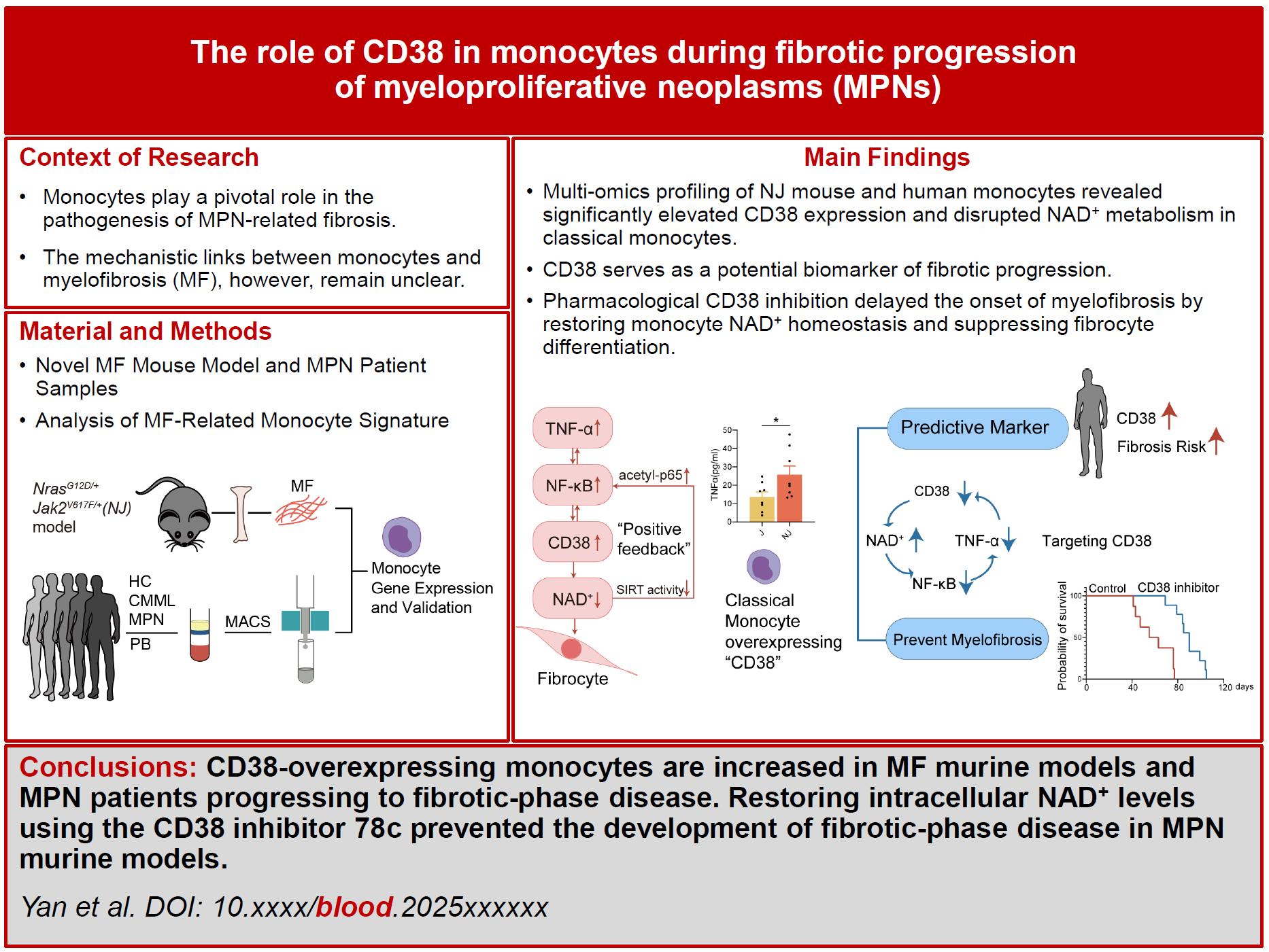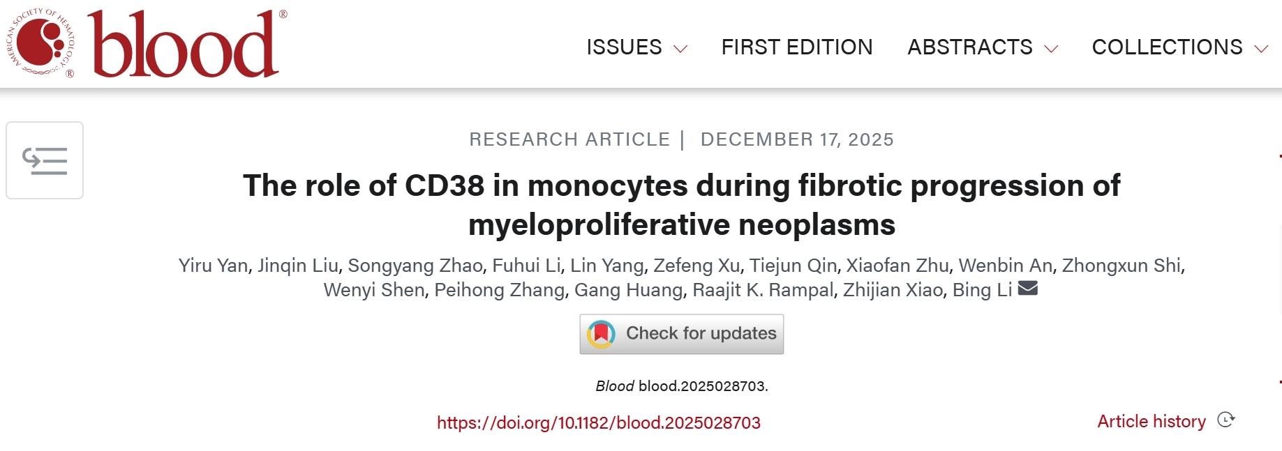 2025年12月17日,中国医学科学院血液病医院(中国医学科学院血液学研究所)肖志坚/李冰团队在《Blood》(IF=23.1)在线发表题为“The role of CD38 in monocytes during fibrotic progression of myeloproliferative neoplasms”的研究论文。首次发现靶向抑制CD38恢复烟酰胺腺嘌呤二核苷酸(NAD+)水平能够有效延缓骨髓纤维化的进展,高表达CD38的单核细胞能够作为预测骨髓纤维化进展的重要标志物。