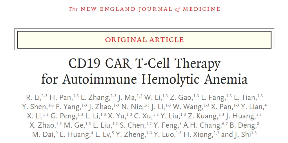 2026年1月15日,中国医学科学院血液病医院(中国医学科学院血液学研究所)施均/熊海清团队在《New England Journal of Medicine》期刊(IF=78.5)在线发布了题为“CD19 CAR T-Cell Therapy for Autoimmune Hemolytic Anemia”的重大研究成果,体现了所院再生医学学科在创新性细胞与基因治疗领域的国际领先地位。