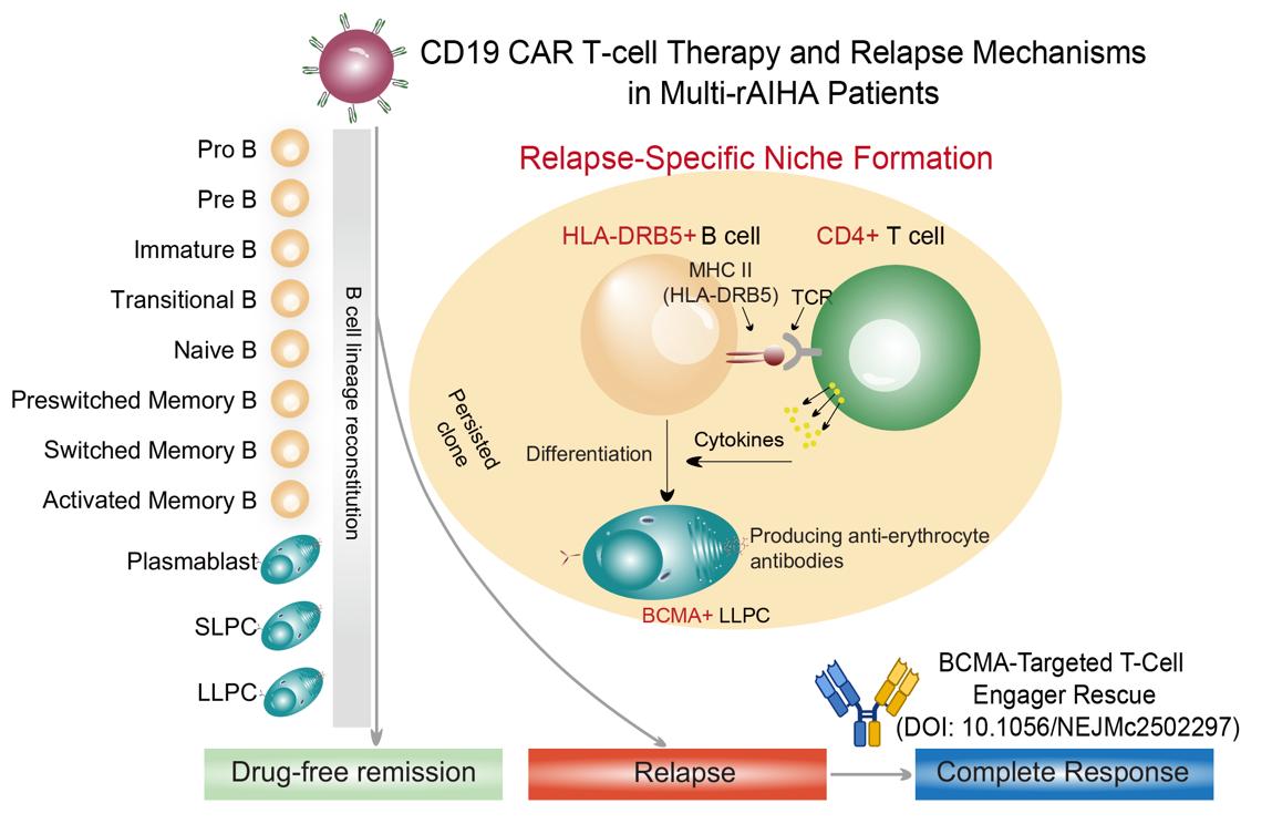 该研究中应用了我国自主研发的自体CD19 CAR T细胞,治疗多线药物失败的AIHA患者,取得了显著疗效与良好的安全性。患者实现了长期无药物治疗缓解,为常规药物治疗失败的患者提供了一种新的挽救性治疗方案。至此,研究团队在国际上率先建立了AIHA患者的细胞免疫治疗新体系:常规药物治疗失败后接受自体CD19 CAR T细胞治疗,BCMA×CD3双特异性抗体(T细胞衔接器,TCE)二次挽救治疗CAR T细胞治疗复发的患者(Zhang L, et al, N Engl J Med, 2025)[8]。这一细胞免疫治疗新体系为AIHA患者带来临床治愈的希望。