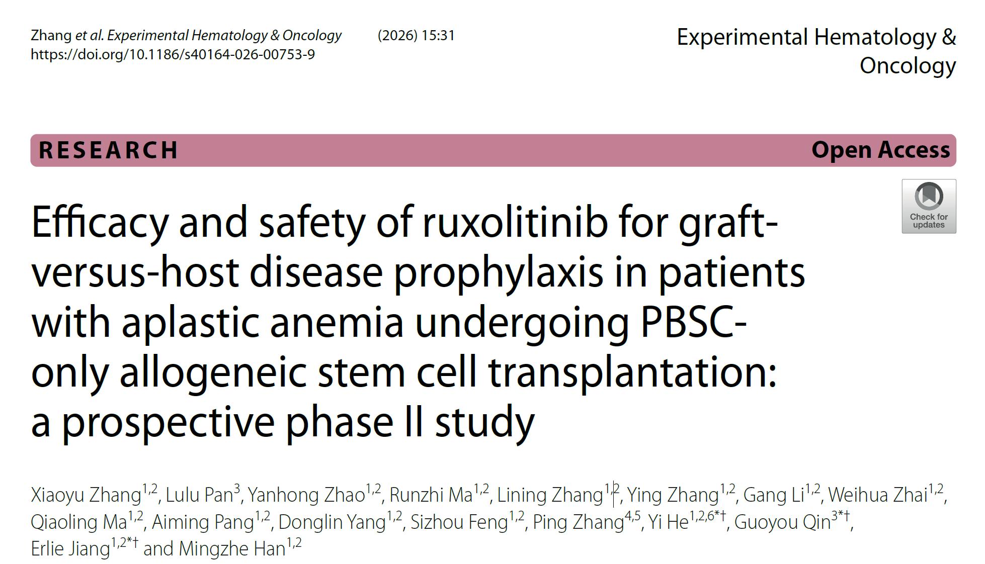 近日,中国医学科学院血液病医院(中国医学科学院血液学研究所)姜尔烈主任医师、何祎主任医师和复旦大学秦国友教授合作在《Experimental Hematology & Oncology》(IF=13.5)在线发布了题为“Efficacy and safety of ruxolitinib for graft versus-host disease prophylaxis in patients with aplastic anemia undergoing PBSC-only allogeneic stem cell transplantation: a prospective phase II study”的研究论文。该研究首次通过前瞻性II期临床试验证实,围移植期加用芦可替尼作为GVHD预防药物,能安全、有效地降低接受仅外周血干细胞移植的再生障碍性贫血患者移植后II-IV级急性移植物抗宿主病(aGVHD)的发生率,并显著改善患者无GVHD-无失败生存率。