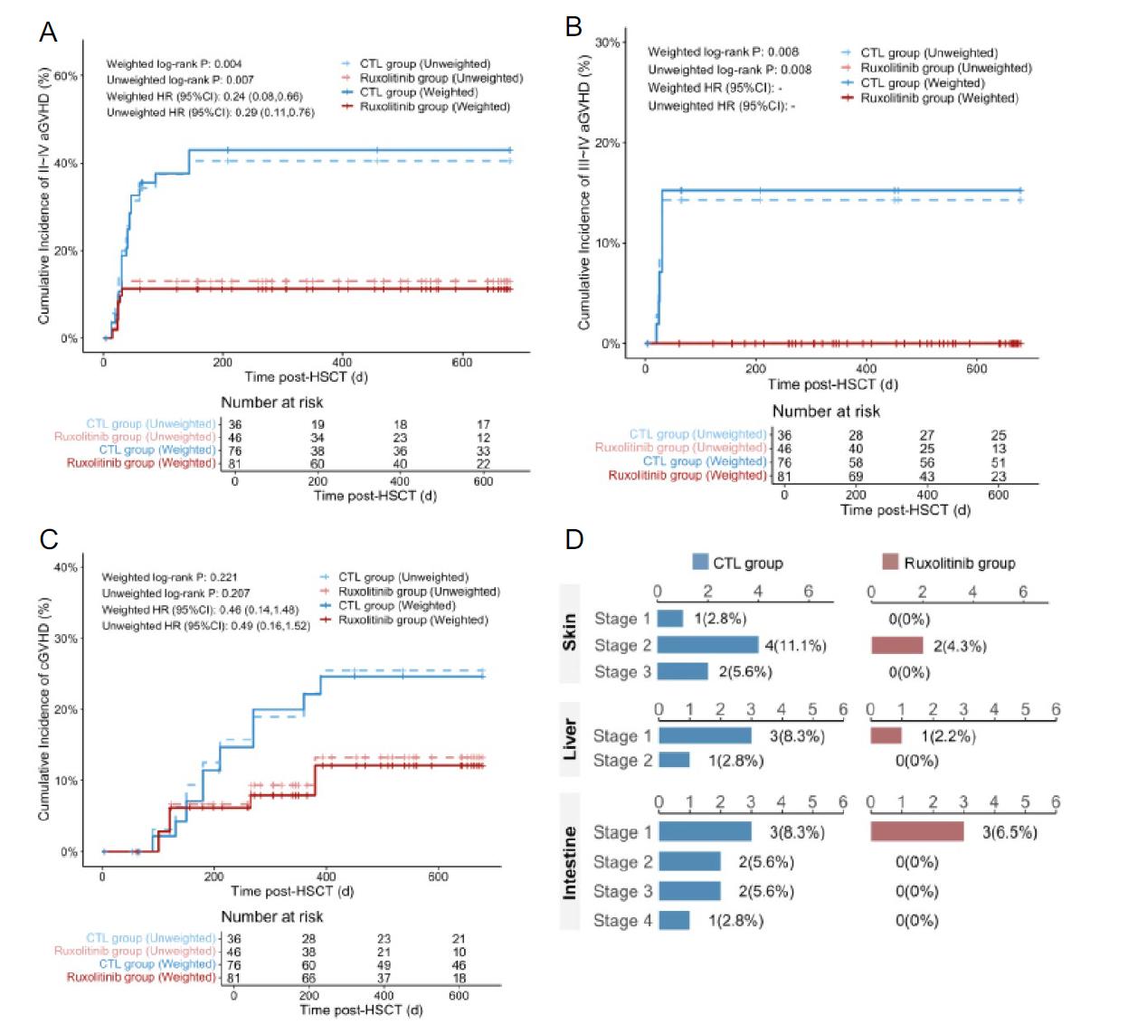 该研究为一项单臂、前瞻性II期试验,共入组46例患者,在标准GVHD预防方案(钙调磷酸酶抑制剂+甲氨蝶呤±霉酚酸酯)基础上,自预处理开始加用芦可替尼(5mg,每日两次)至移植后3个月;并与36例历史对照组患者(即仅接受标准GVHD预防)作为对照。研究的主要终点是移植后6个月内II-IV级aGVHD的累积发生率。