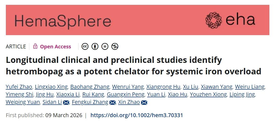 近日,中国医学科学院血液病医院(中国医学科学院血液学研究所)张凤奎/赵馨团队在《HemaSphere》(IF=14.6)在线发表了题为“Longitudinal clinical and preclinical studies identify hetrombopag as a potent chelator for systemic iron overload”的研究论文。该研究通过纵向临床队列与临床前研究鉴定血小板生成素受体激动剂(TPO-RA)海曲泊帕(HPAG)为强效的铁螯合剂,可预防与治疗系统性铁过载。
