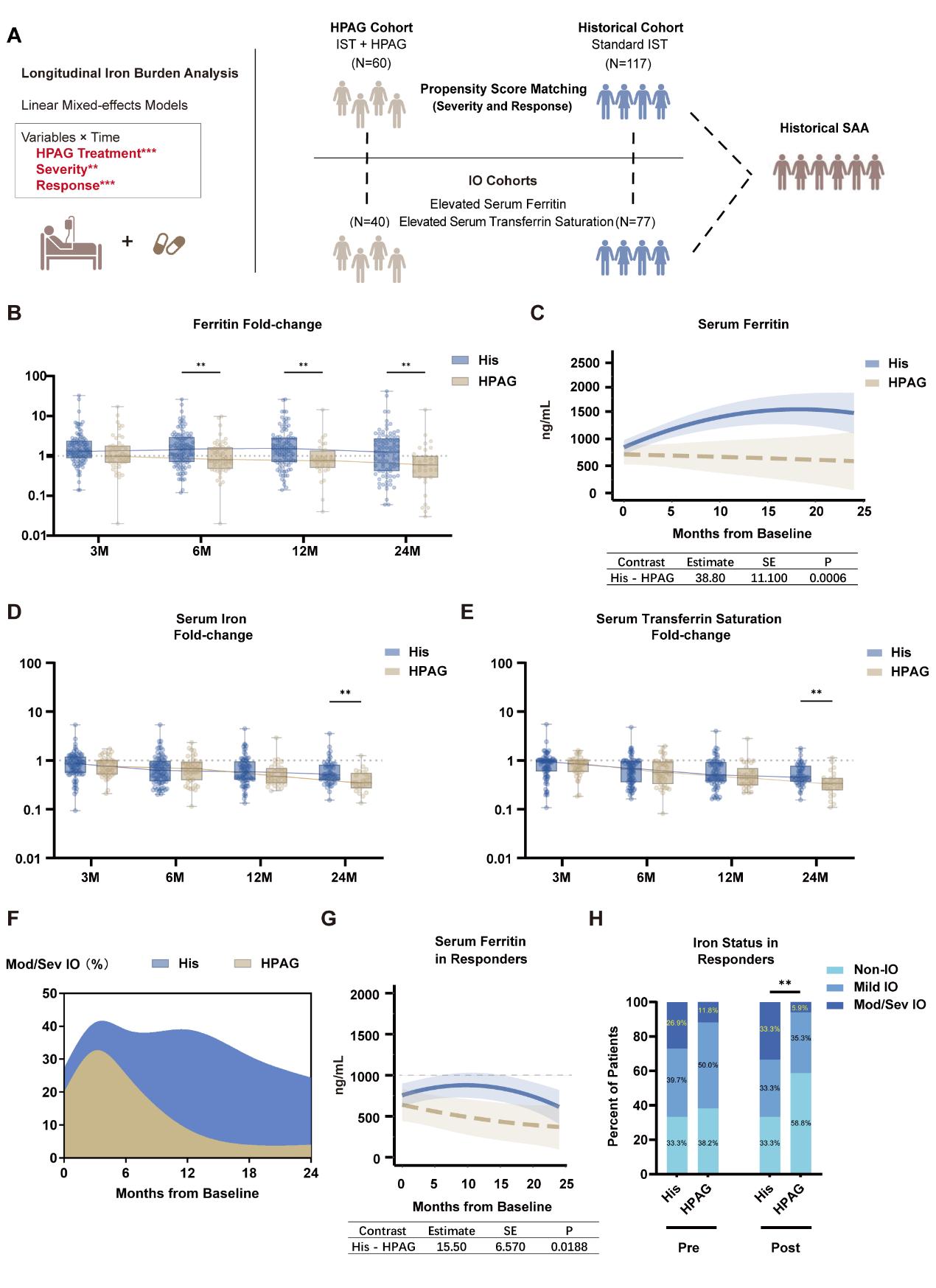 该研究首先对接受标准免疫抑制治疗(IST)的重型再生障碍性贫血(SAA)患者铁负荷进行了系统的纵向分析,发现相当一部分患者在确诊时及随访过程中已出现输血相关铁过载,并伴随体内毒性铁及脂质过氧化物的积累。在模拟输血相关铁过载的临床前模型中,研究发现HPAG能够有效治疗系统性铁过载,其铁螯合作用与临床可用的铁螯合剂相当,并在机制上独立于TPO-RA作用。随后,通过线性混合效应模型和倾向得分匹配方法,在接受IST联合HPAG治疗的临床队列中证实,HPAG能够显著降低SAA患者的铁负荷,并减少体内毒性铁及脂质过氧化物的积累。在既往已存在铁过载或具有铁过载风险的患者中,HPAG能够有效预防和治疗继发性铁过载,其带来的获益超出了TPO-RA作用本身。
