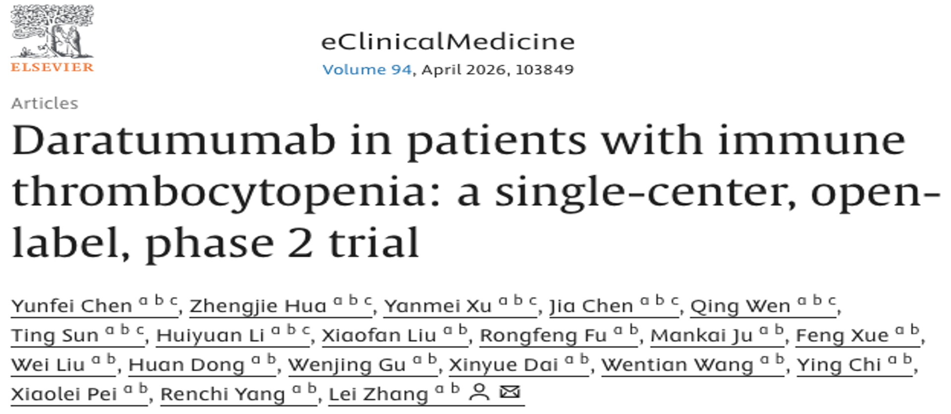 2026年3月26日,中国医学科学院血液病医院(中国医学科学院血液学研究所)张磊/杨仁池团队在《eClinicalMedicine》(IF=10.0)在线发布了题为“Daratumumab in patients with immune thrombocytopenia: a phase 2, single-center, open-label trial”的研究论文。截至目前,此研究是国际上规模最大的一项评估CD38单克隆抗体治疗ITP疗效和安全性的临床研究。