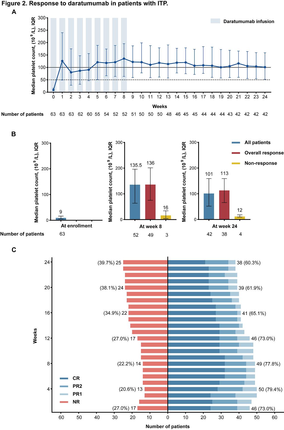 该研究为一项单臂、开放标签、2期临床研究,共纳入对一线糖皮质激素以及至少一种二线治疗(包括促血小板生成药物和/或抗CD20单克隆抗体)均无效的63例ITP患者。研究方案包括为期4周的筛选期、8周的治疗期和16周的随访期。达雷妥尤单抗以16毫克/公斤体重的剂量静脉给药,每周一次,连续给药八周。主要疗效终点定义为8周内连续2次血小板计数≥50×109/L的患者比例。